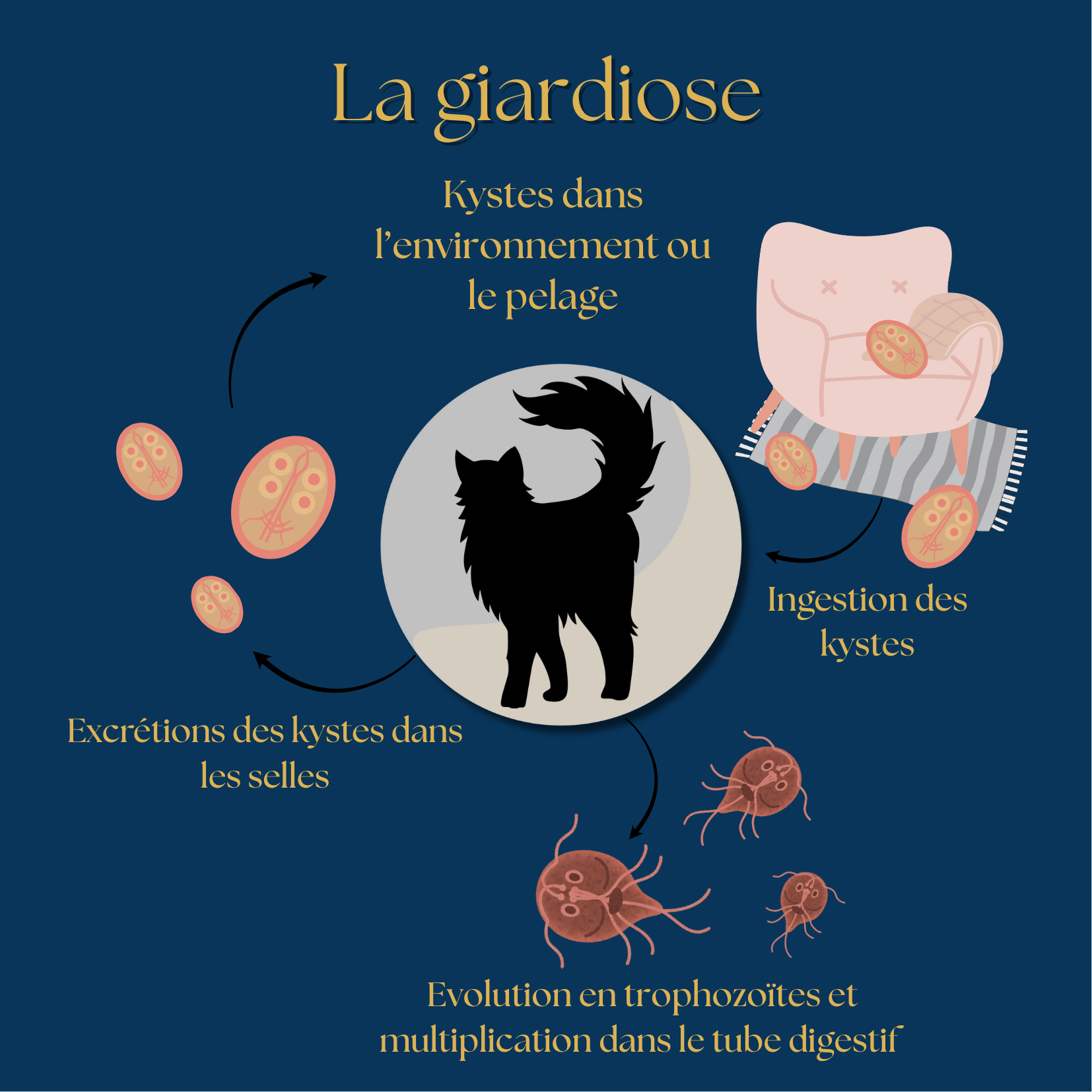 - Un traitement sera mis en place après exclusion de la Tritrichonomonose (parasites intestinaux qui cohabitent souvent avec les giardias et qui deviennent résistant à tous traitement si un traitement contre les giardias est mis en place).